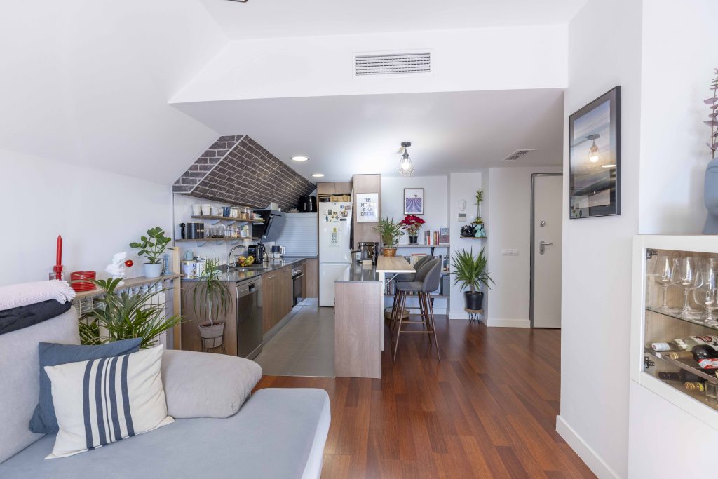 Amplio y luminoso salón con salida directa a terraza. Cocina en office totalmente amueblada con zona comedor.